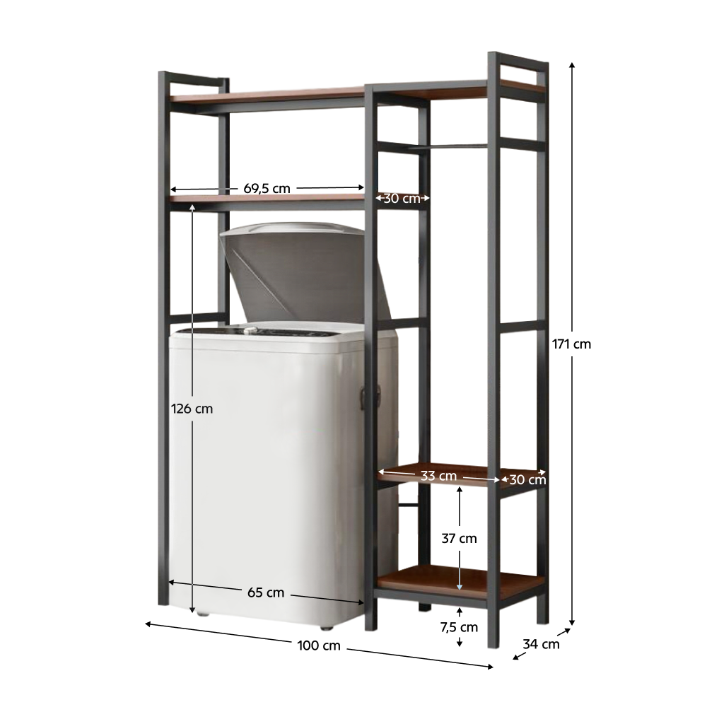 A DELSIN egy olyan polcállványtípus, amely ideális a fürdőszoba vagy mosókonyha terének optimalizálására. Lehetővé teszi a mosógép feletti tér kihasználását és a szükséges dolgok tárolását. Az oldalán és a felső részén polcokkal rendelkezik. Ezeket praktikus módon felhasználhatja a tisztítószerek, tárolókosarak és egyéb szükséges kiegészítők rendezésére, amelyeket a házimunkák során kéznél szeretne tartani. A polcállvány része egy praktikus fém rúd is, amelyet textíliák szárítására használhat. Laminált MDF-ből készült, és masszív fém szerkezettel rendelkezik, amely a sötét tölgy és fekete színkombinációjában tündököl.