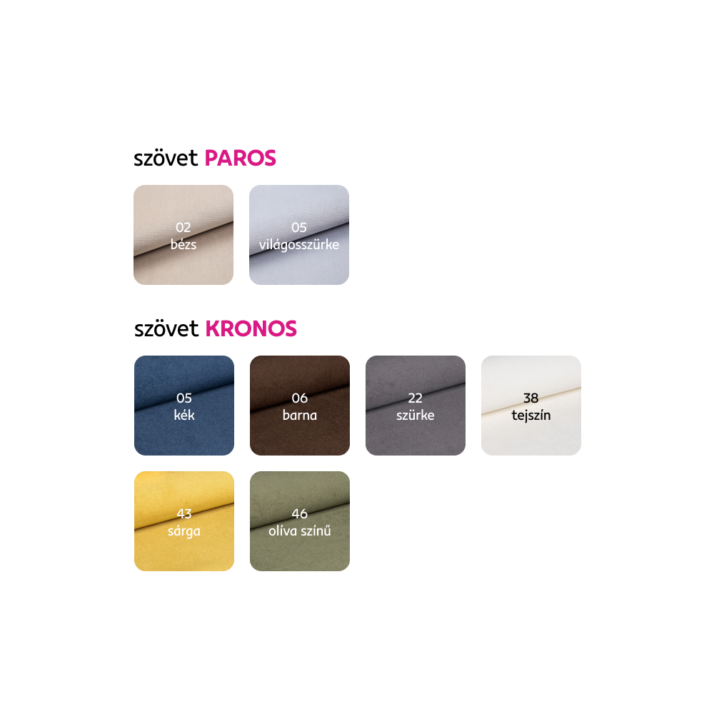 Megvásárolható a Kronos szövet 6 színváltozatában és a Paros szövet 2 színében ár: 474 500 Ft. Egyedi megrendelés esetén az összeg 20%-át előlegként kell kifizetni. Az előleg befizetése után kérése a gyártásba kerül. Szállítási idő 6-8 hét.