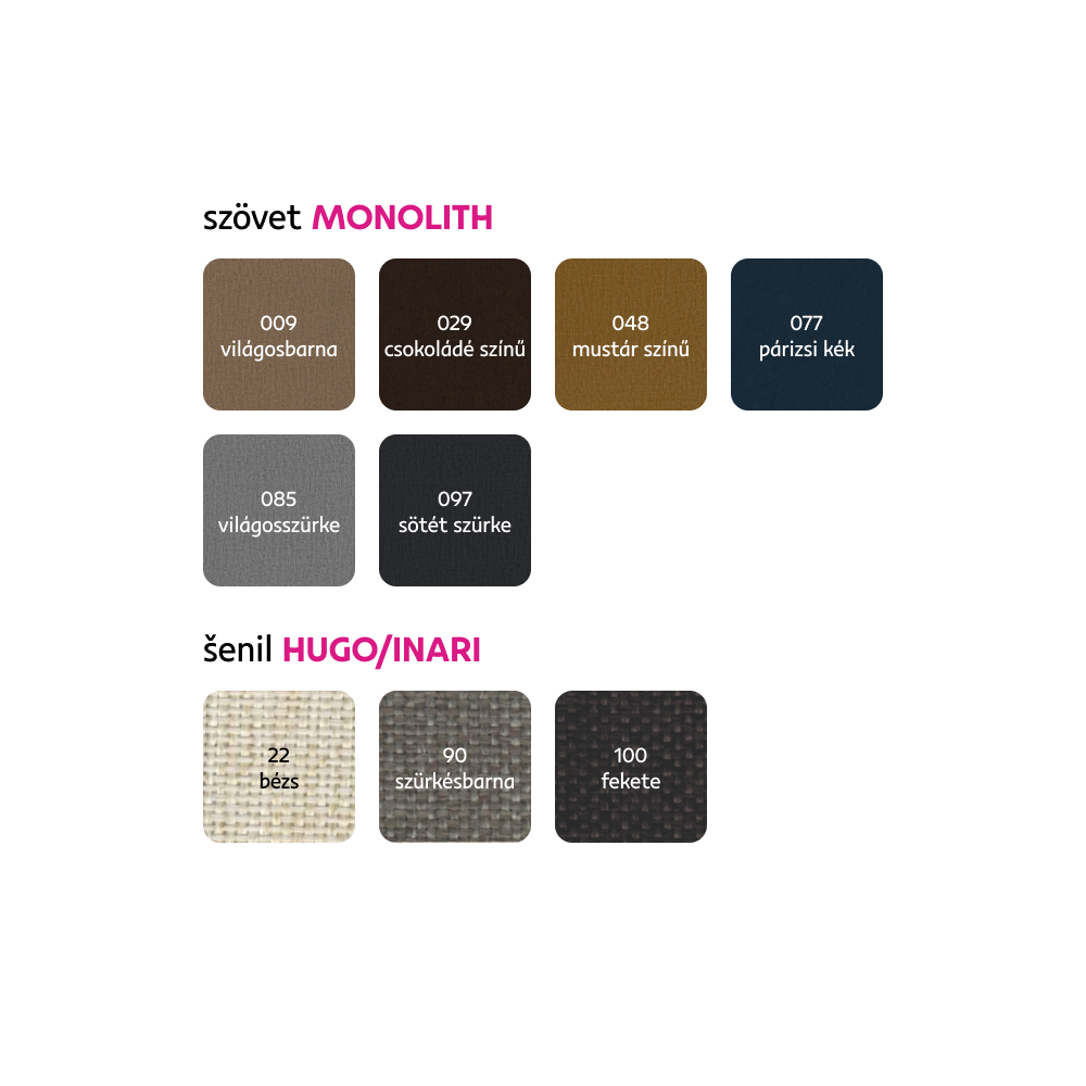 Megrendelhető 3 színváltozatban Hugo/Inari szövetből, vagy az anyagban Monolith, ára 485 500 Ft. Egyedi megrendelés esetén szükség van az adott összegnek a 20%-át befizetni,mint előleg. Az előleg befizetése után az Ön követelményét benyújtjuk a gyártónak. Szállítási idő: 6-8 hét.