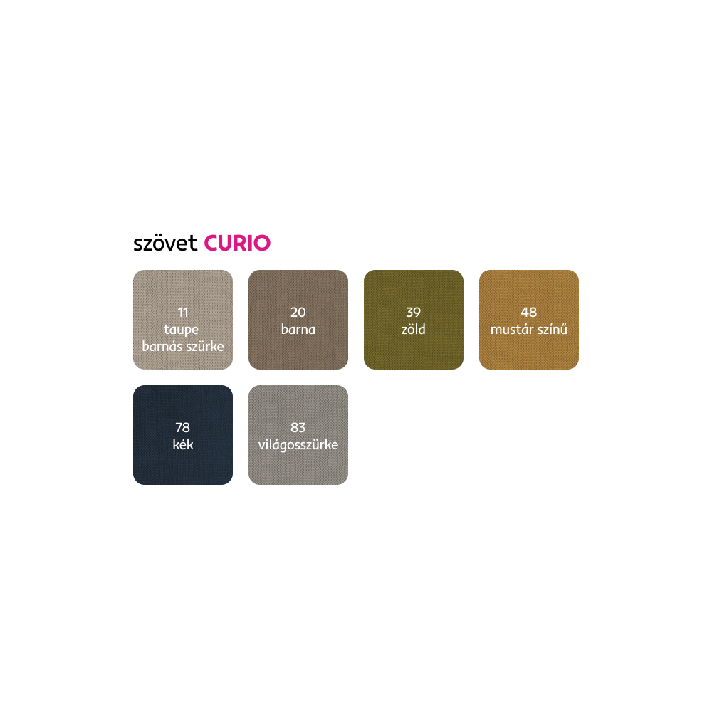 Megrendelhető a Curio szövet 6 színváltozatában ár: 488 900 Ft.. Egyedi megrendelés esetén az összeg 20%-át előlegként kell befizetni. Az előleg befizetése után kérése a gyártásba kerül. Szállítási idő 6-8 hét.