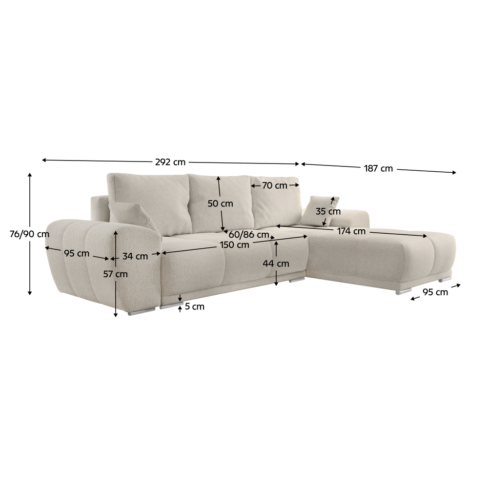 Méretek (SzxMéxMa): 292x187x76/90 cm