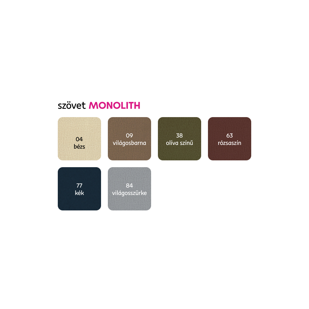 Megrendelhető a Monolith szövet 6 színváltozatában, ár: 388 900 Ft.. Egyedi megrendelés esetén az összeg 20%-át előlegként kell befizetni. Az előleg befizetése után kérése a gyártásba kerül. Szállítási idő 6-8 hét.