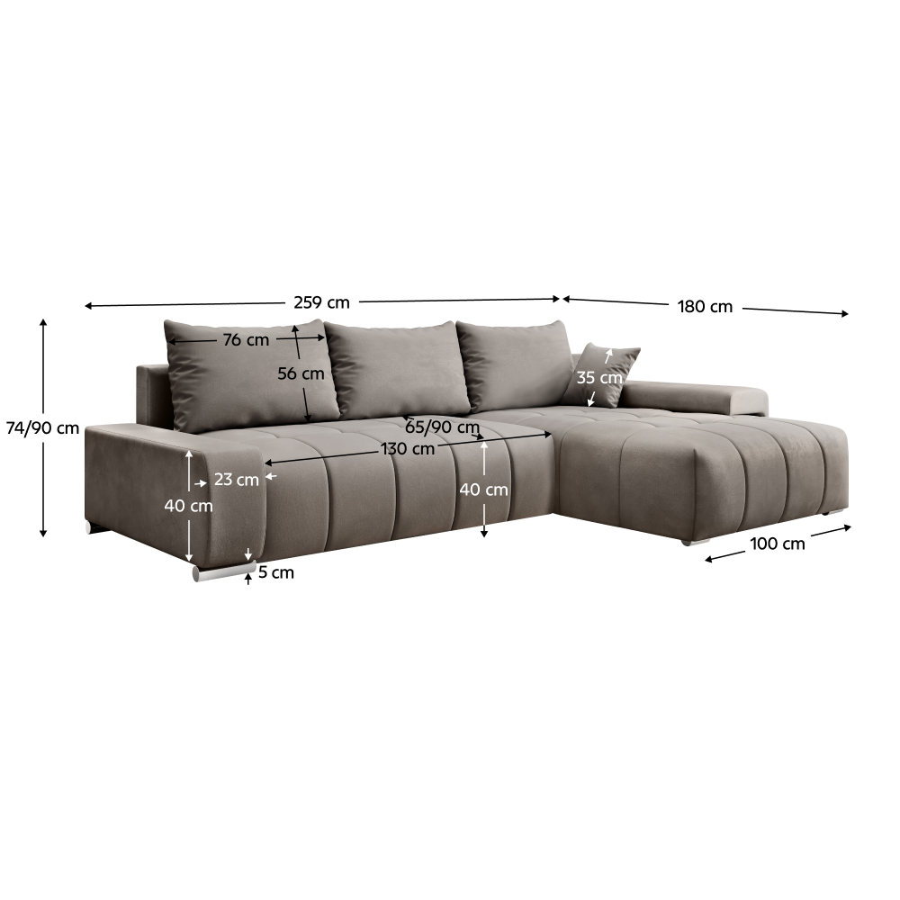Méretek (SzxMéxMa): 259x180x74/90 cm