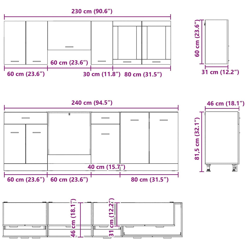 Ez a modern konyhabútor szett elegáns dizájnnal és okos tárolási megoldásokkal vár, tökéletes a mai konyhákhoz! Szép matt felülete és sima textúrája van, mérete 240 x 46 x 81,5 cm, így könnyen beilleszthető a konyhádba. Ha stílusos és praktikus főzőterületet keresel, ezek a bútorok eleganciát hoznak, miközben megkönnyítik a napig feladatokat. Használhatod őket mindenféle eszközhöz, hozzávalókhoz vagy edényekhez - rengeteg tárolót kapsz, anélkül, hogy feláldoznád a stílust.