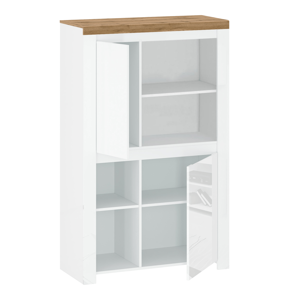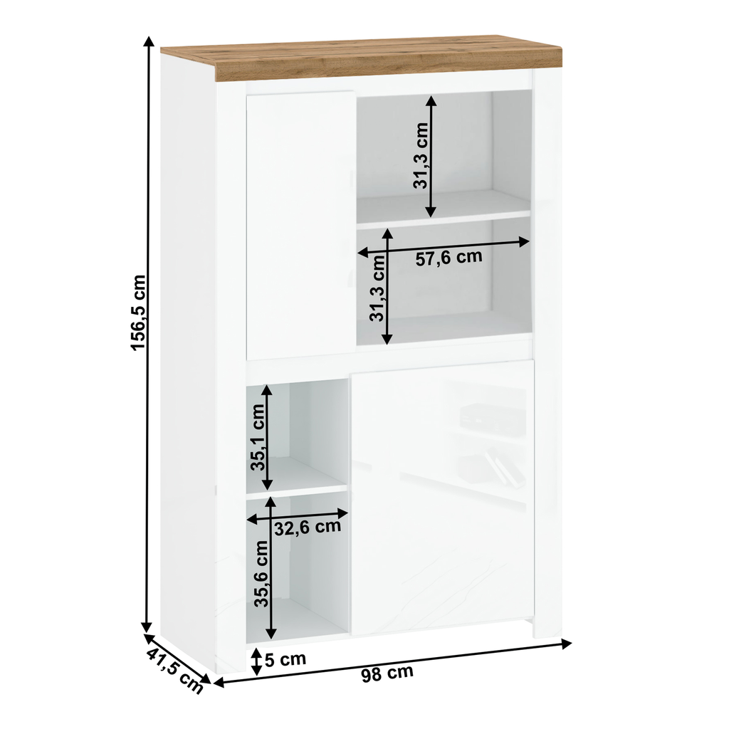 Anyag: laminált DTD/ABS élek/MDF Szín: fehér extra magasfényű/wotan tölgy Méretek(SzxMéxMa): 98x41,5x156,5 cm Az alsó tér magassága a padlótól: 5cm Anyag vastagsága: 1,6 - 2,2 cm Két szekrény A szekrényben polcok vannak Nyitott tárhely polcokkal Felső polcok méretei (SzxMa): 57,6x31,3 cm Első alsó polc méretei (SzxMa): 32,6x35,1 cm Második alsó polc méretei (SzxMa): 32,6x35,6 cm MDF ajtók Nyitás/zárás a kivágással Bontásban szállítva