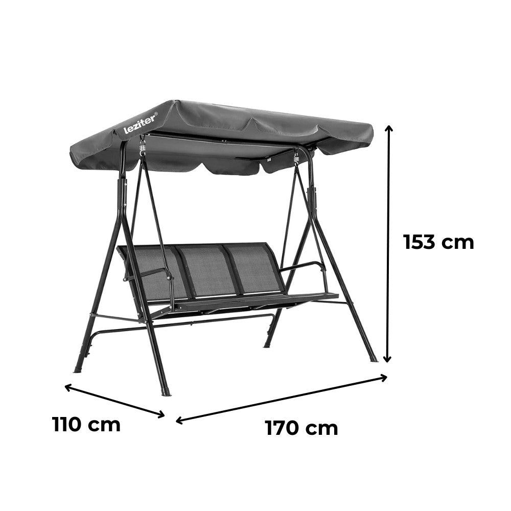Ez a háromszemélyes, masszív hintaágy tökéletes választás kertbe, teraszra vagy akár nagyobb erkélyre. Egyedülálló stabilitását az erős, acél váz biztosítja. A Como kerti hintaágy 170x110x153 cm-es. Az ülőtámla magassága 54 cm, ülőszélessége és mélysége 130x48,5 cm, melynek köszönhetően bőséges helyet biztosít a kényelmes pihenéshez, miközben maximális teherbírása 250 kg, így akár hárman is kényelmesen hintázhattok rajta.