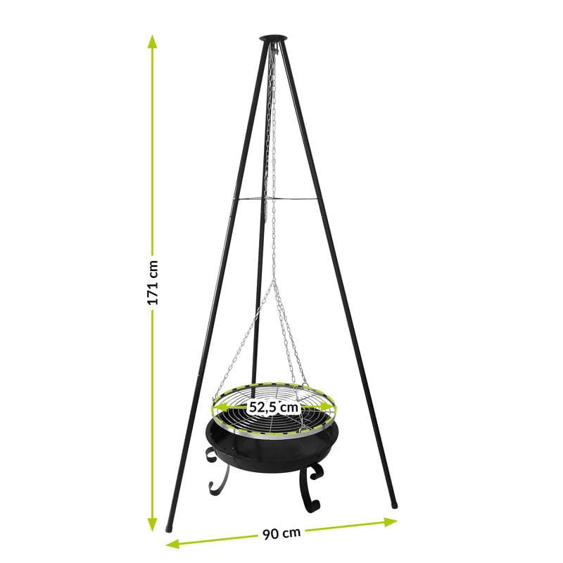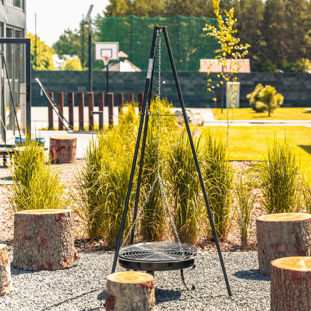 A háromlábú állványon lévő függő grillrács egyszerű magasságállítása
