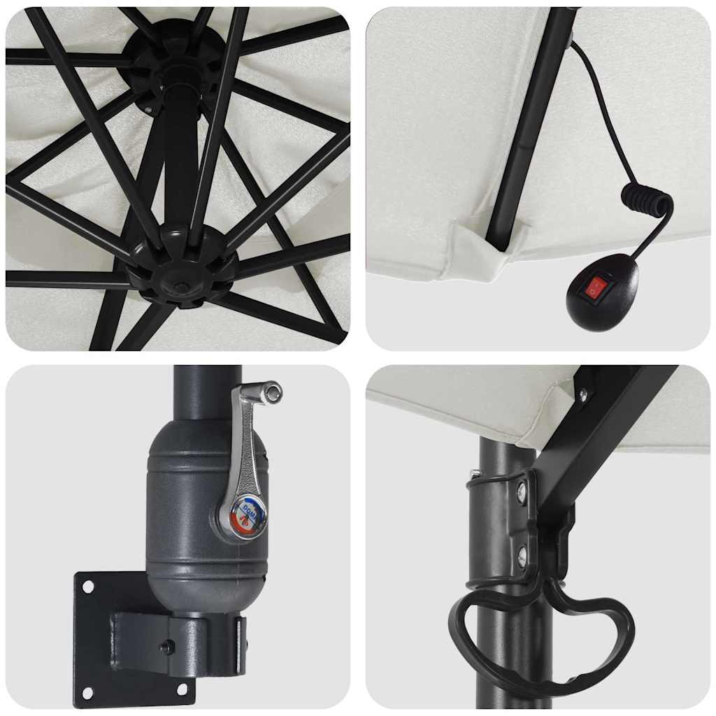 - Robosztus Anyagok: Poliészter napernyő és erős fém keret, ami jól néz ki és tartós. UV-álló poliészter megőrzi a színeit, miközben kiszűri a káros sugarakat.