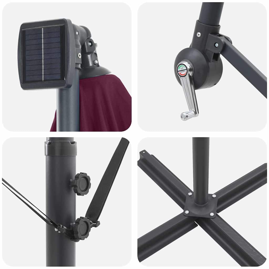 - Tartozékok: Kézi hajtókarral jön, ami megkönnyíti a nyitást és zárást, és dönthető mechanizmussal is rendelkezik, hogy mindig dőlhessen a napfénytől. Ráadásul napenergiával működő LED lámpákat is tartalmaz, amik feldobják az estéidet anélkül, hogy az energiaszámládat növelnék.