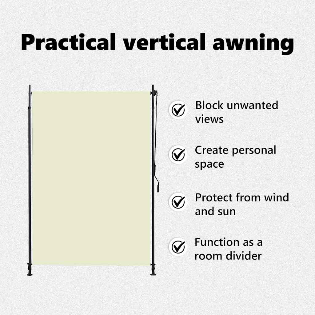 A poliamid bevonattal ellátott kiváló minőségű anyag fakulásálló és védelmet nyújt a nap káros sugaraival szemben, miközben légáteresztő-képességét is megtartja. Könnyen fel- és letekerhető a kézi karral. Ez a függőleges redőny két álló állvánnyal rendelkezik, melyek magassága 2 és 3 m között állítható. A legtöbb mennyezetmagasság esetében használható, és könnyen felszerelhető.