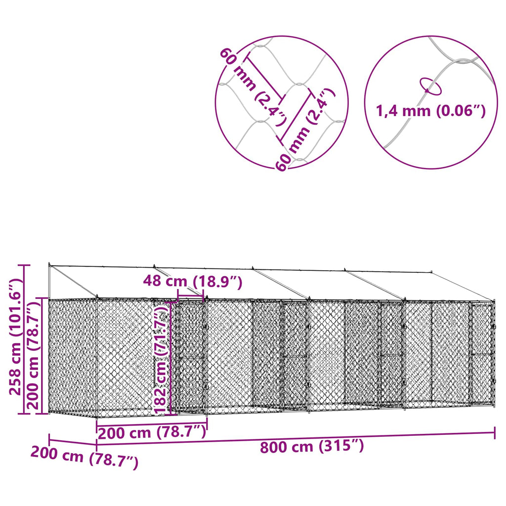vidaXL Kutya ketrec tetővel Ezüst 800 x 200 x 258 cm Acél és PE