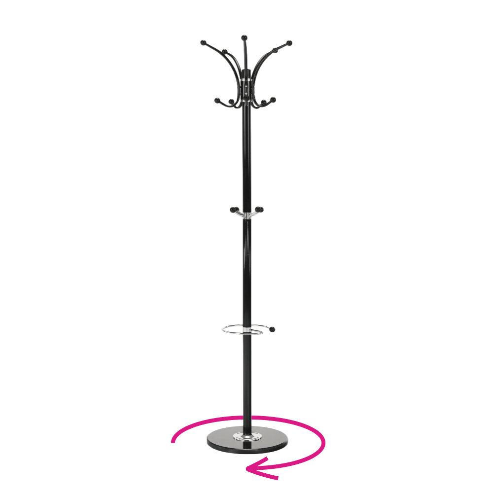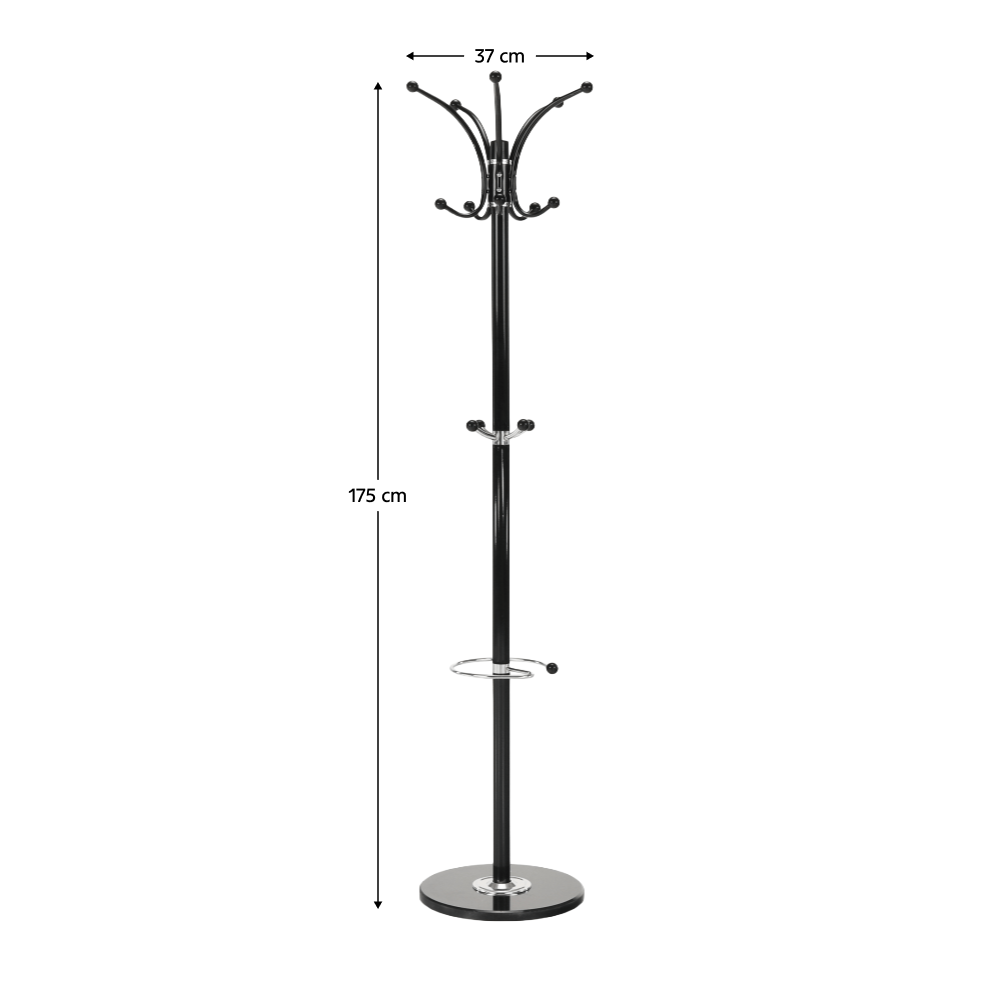 Anyag: fém/ márvány (alapzat) Kivitel: fekete Méretek(SzéxMéxMa): 37x37x175 cm Szétszerelve szállítva. Golyóscsapággyal Forgó Kampó teherbírása: 3 kg