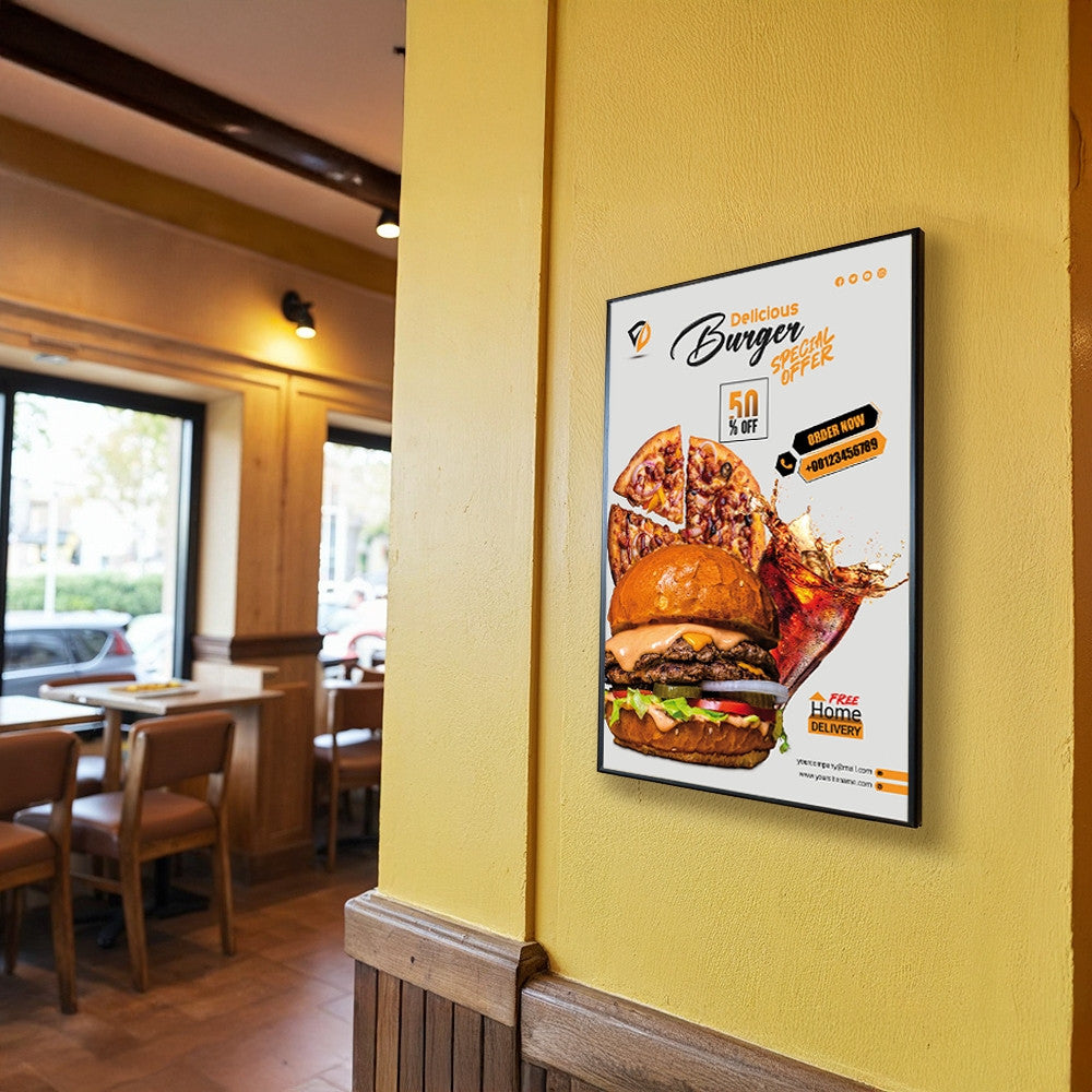 Ez a fekete A4 plakátkeret tartós alumínium kerettel, edzett üveggel készül, mely egyszerre esztétikus, praktikus és modern. Letisztult dizájnjának és pontos méreteinek köszönhetően minden térbe professzionális megjelenést visz.