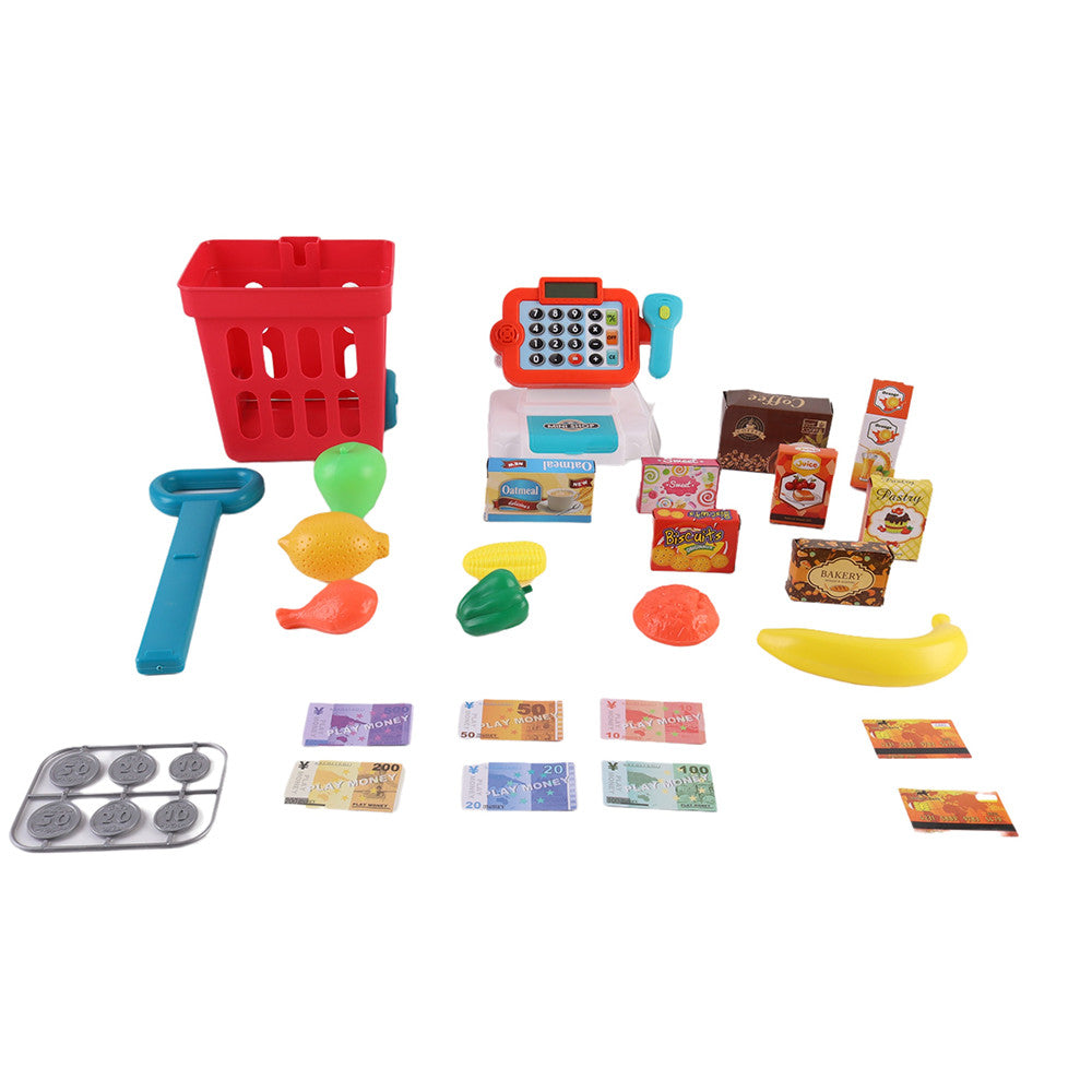 Játék bolti pénztárgép tele bevásárlókocsival, 32 db-os