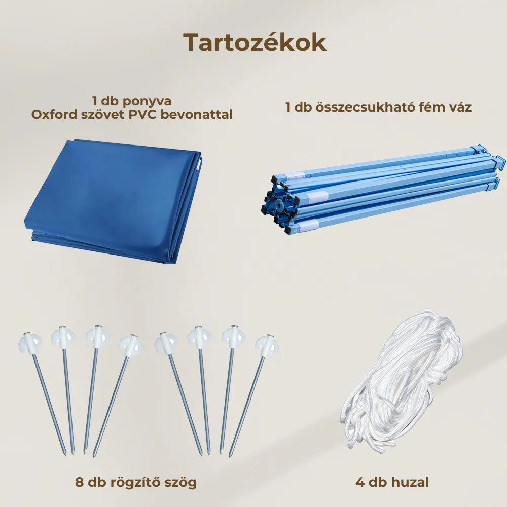 - Tartozékok: A pavilon stabilitását a sarkoknál található karikák, a mellékelt huzalok és rögzítő szegek biztosítják. A csomag tartalmazza mind a 4 db huzalt, mind a 4 db rögzítő szöget, így garantálva a biztonságos és stabil felállítást.