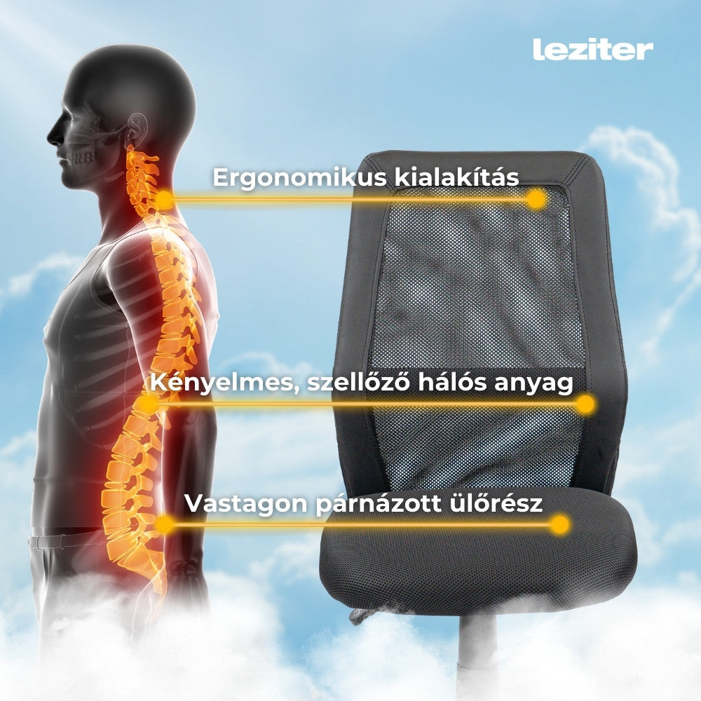 - Légáteresztő hálós háttámla: A hálós felület kiváló légáteresztést biztosít, így hosszabb ideig is kényelmes marad, anélkül, hogy megizzadnál.
