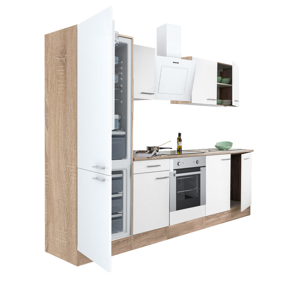 Yorki 270 konyhabútor sonoma tölgy korpusz,selyemfényű fehér front alsó sütős elemmel alulfagyasztós hűtős szekrénnyel