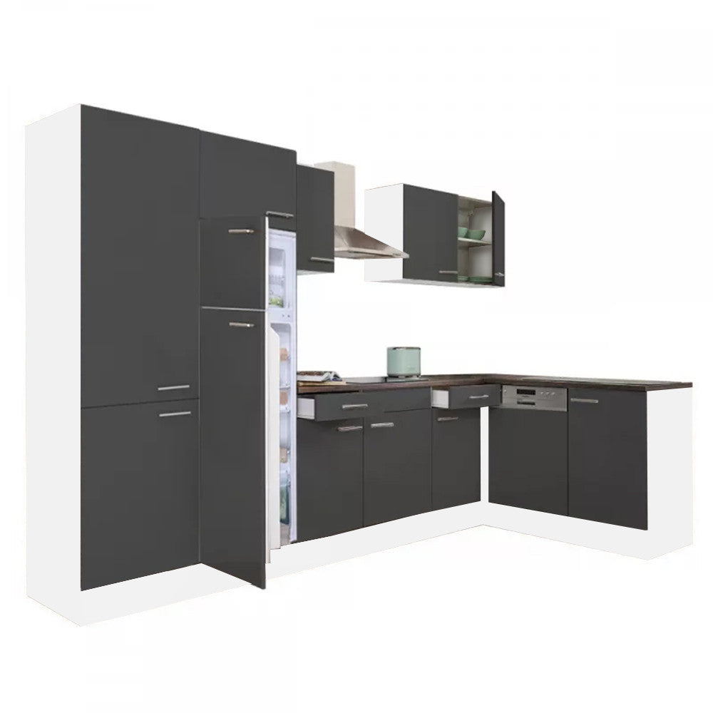 Yorki 340 sarok konyhabútor fehér korpusz,selyemfényű antracit fronttal polcos szekrénnyel és felülfagyasztós hűtős szekrénnyel
