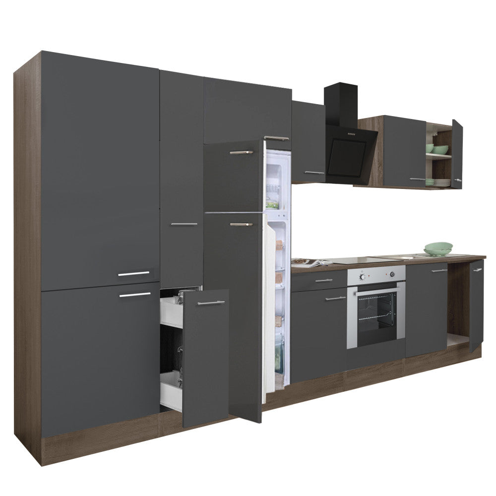 Yorki 360 konyhabútor yorki tölgy korpusz,selyemfényű antracit front alsó sütős elemmel polcos szekrénnyel és felülfagyasztós hűtős szekrénnyel
