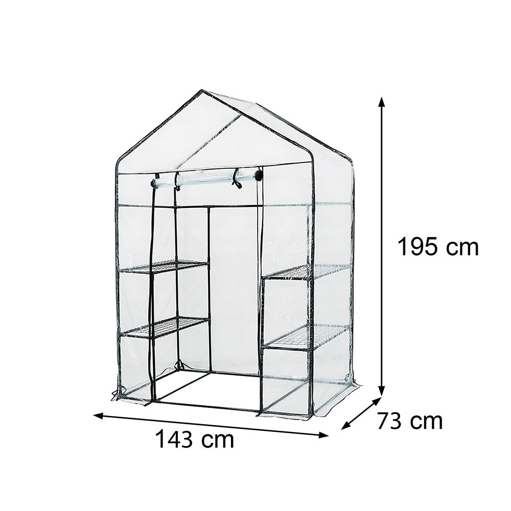 A 143x73x195 cm-es méret keskeny, de magas kialakítású, így kiválóan kihasználható kisebb helyeken is, miközben elegendő teret biztosít a növények számára. A tartós, UV-álló fólia megbízhatóan védi a növényeket az időjárás viszontagságaitól, beleértve a túlzott napsugárzást, a hideget és a szelet. A felhúzható ajtó nemcsak kényelmes hozzáférést biztosít, de lehetővé teszi a megfelelő szellőztetést is, ami elősegíti az optimális belső környezet fenntartását.