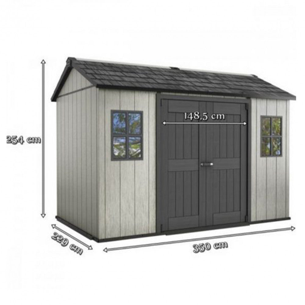 A Keter Oakland 1175 kerti ház szilárd műanyagból készül. A magassága 242 cm magas, 350 cm széles és 229 cm mély. A ház maximum fehasználási területe 6,5 m2 ! Ez a gyártó által javasolt modellek közül a legnagyobb, minden bizonnyal elfér minden benne, ami a kert szépítéséhez szükséges.