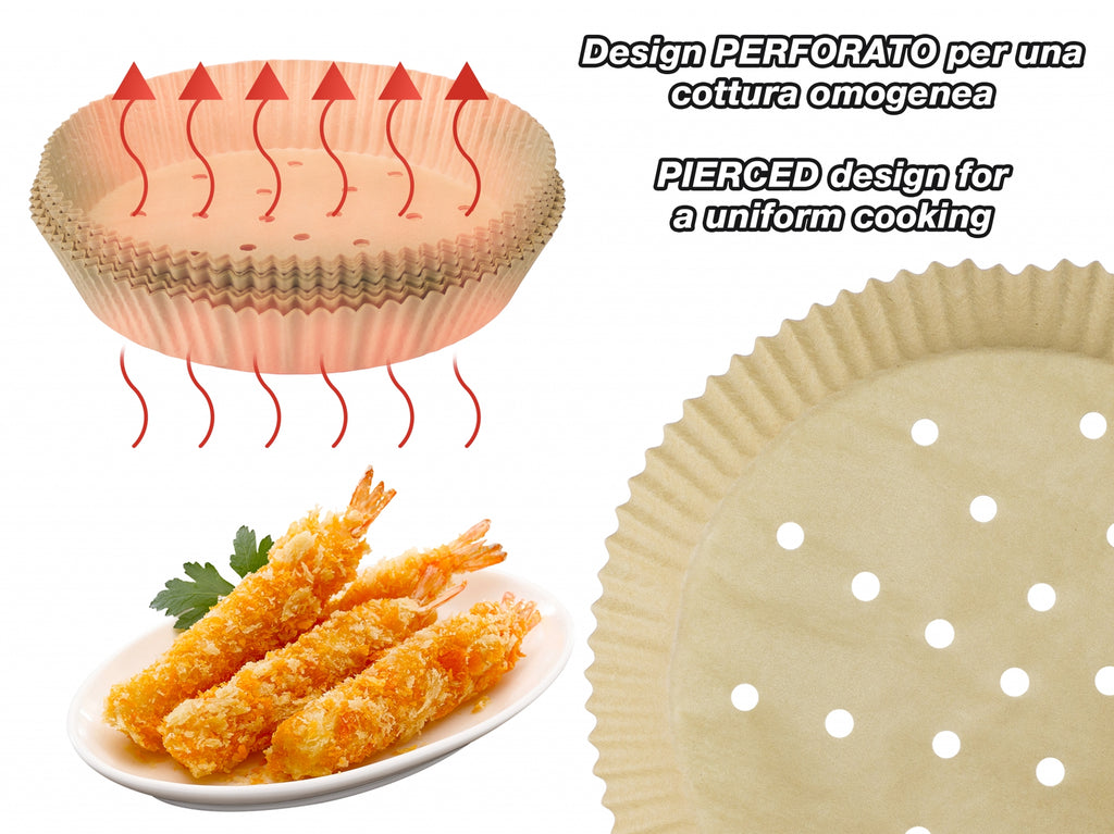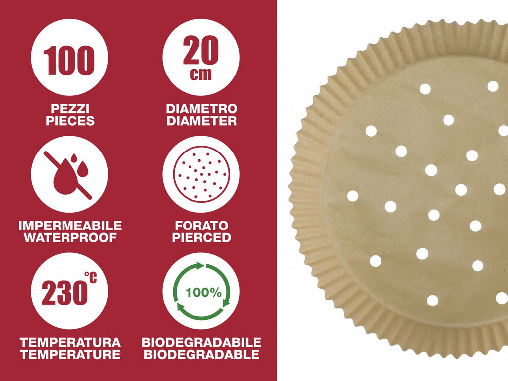 Univerzális sütőpapír olaj nélküli sütőkhöz-100db/csomag-Kompatibilis minden típusú olajsütőhöz, amely sütőkosarának az ámérője 20cm. A lyukacsos kilakítás miatt elősegíti a légáramlást a hatékonyabb sütési eredmény eléréséhez. A sütőpapír tapadás mentes, olaj taszító, vízálló és biologialiag lebomló. Használható tradicionális sütőkben is.