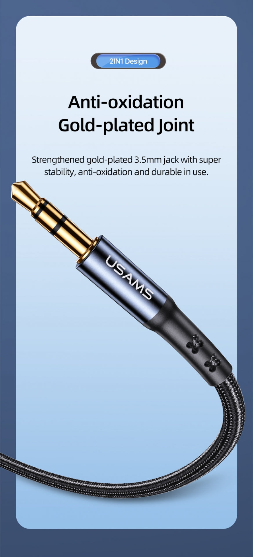USAMS textil borítású jack kábel Type-c csatlkozóval. Széleskörűen használható kábel. Kompatibilis Type-c csatlakozóval ellátott mobil készülékekkel és tabletekkel, laptoppal. Könnyen és gyorsan csatlakoztatható egyéb aux bemenettel rendelkező eszközhöz, mint pl. fejhallgató, mobil telefon, autós hifi stb. Arany bevonatú jack csatlakozó, csavarodásmentes vezeték.