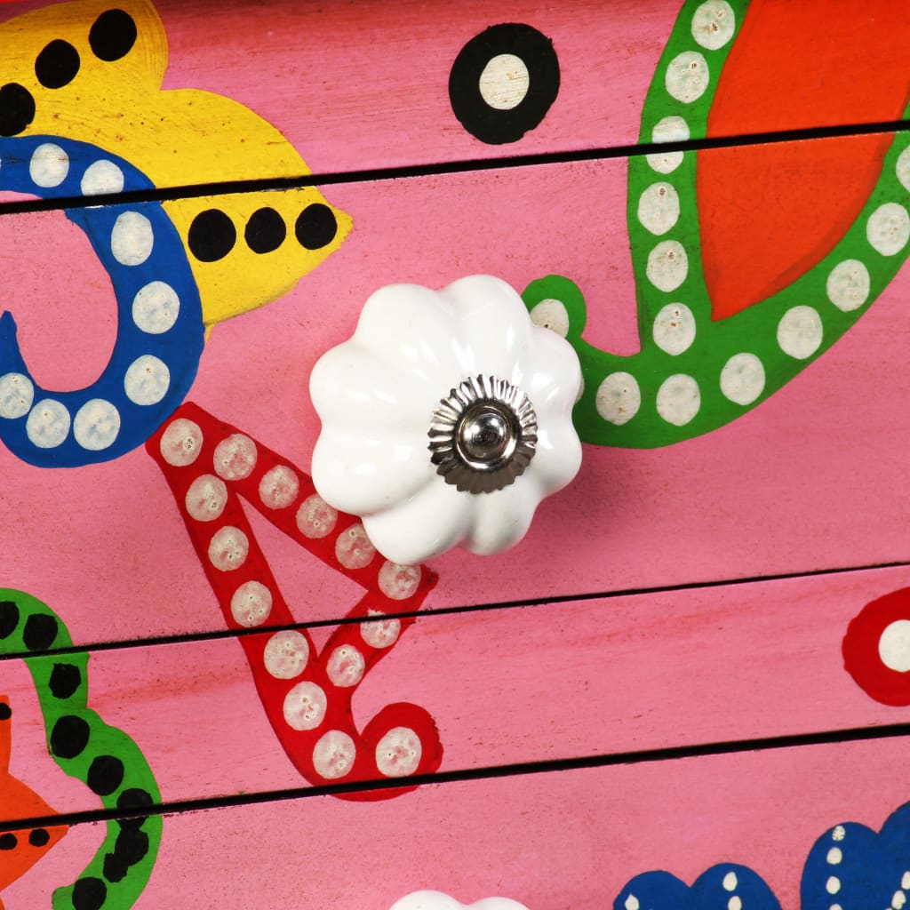 Ez a konzolasztal tömör mangófából, kézzel készült, így masszív, tartós és gyönyörű egyszerre, a kézművesség nyomai pedig kiemelik retró stílusát. A bútort kézzel festett minta díszíti, amely rendkívül részletgazdag, kifinomult megjelenése eleganciát sugároz. A praktikus fogantyúk, amelyekkel a fiókok könnyen kihúzhatók, még tovább növelik a bútor esztétikai hatását.