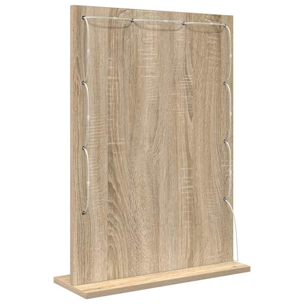 Magas minőségű anyagok: Üveg és mérnöki fa kombinációja biztosítja a stílust és a tartósságot. Az üveg zökkenőmentes tükröződést ad, míg a mérnöki fa stabilitást biztosít, így minden nap igénybe vehető. Beépített LED szalaglámpák: A tükörbe integrált LED szalaglámpák lágy, meleg fehér fényt adnak. Ezek a lámpák jól vannak elhelyezve, növelve a láthatóságot, anélkül, hogy zavaróak lennének a szemednek, tökéletesek a kellemes légkör megteremtéséhez. Univerzális lapos tükör: A lapos tükör dizájnának köszönhetően tiszta, egyenletes képet ad, nagyszerű a napi szépségápoláshoz vagy bármilyen dekorációhoz. A természetes és mesterséges fényben is elegáns és tiszta tükröződést biztosít, fokozva a szoba fényét. Energiatakarékos USB tápegység: USB forrással működik, így praktikus és energiatakarékos. Az alacsony 5V-os igénye megfelel a modern szabványoknak, lehetővé téve a különböző elektronikus eszközökhöz való egyszerű csatlakozást. Könnyű karbantartás: Az állapotának fenntartása pofon egyszerű. Csak egy nedves ruhával töröld le, hogy elkerüld a karcolásokat. Ne használj durva vegyszereket, mert ezek kárt okozhatnak. Rendszeres kíméletes tisztítás mellett sokáig megőrzi vonzerejét.- Szín: Sonoma tölgy