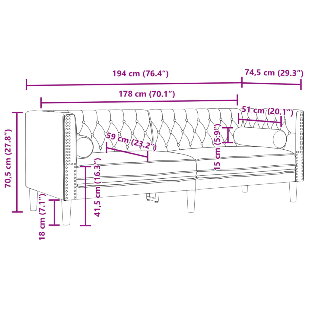 - Chesterfield stílus: A klasszikus gombokkal tűzdelt háttámlával és karfákkal, valamint az egységes hát- és karmagassággal a kanapé minden helyiséget feldob, stílust és kényelmet biztosítva.