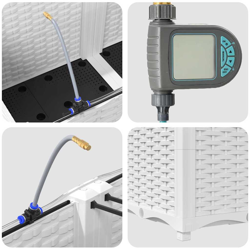 - Beépített locsolórendszer: Egy fejlett locsolórendszerrel felszerelve ez a kertészeti láda leveszi a locsolás rejtvényeit. Beépített csatornáit használva hatékonyan elosztja a vizet közvetlenül a növény gyökereire, biztosítva számukra a megfelelő nedvességet, miközben csökkenti a vízfelesleget, és támogatja az egészséges növekedést.