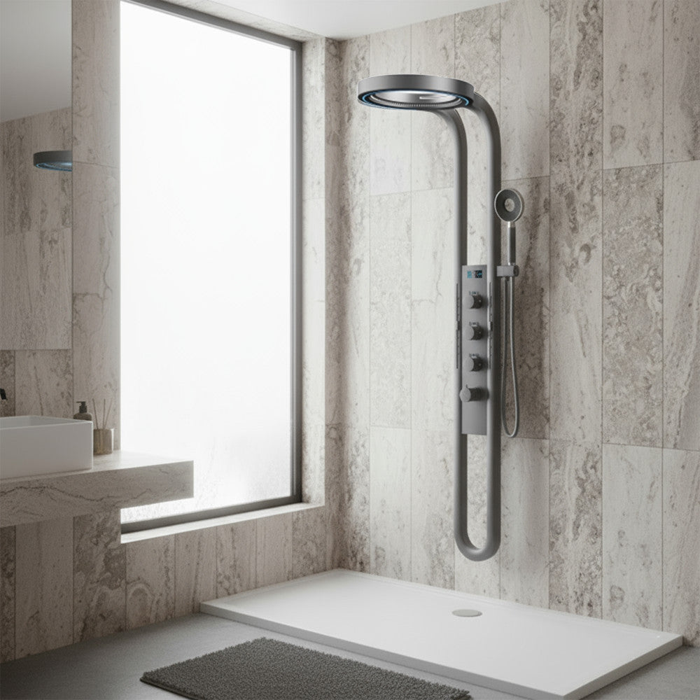 Az Aquajet hidromasszázs zuhanypanel minden zuhanyzást a pihenés és feltöltődés pillanatává tesz. A testfúvókák, a felső zuhany és a kézi zuhany kombinációja egy otthoni mini wellness központot teremt, amely luxust visz a mindennapokba.