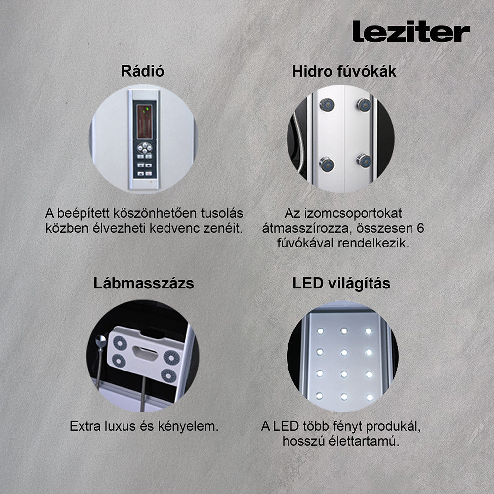 A Lia zuhanykabin számos hasznos funkcióval rendelkezik. Pipere polccal van felszerelve, melynek köszönhetően rendbe tudja tartani a tisztálkodáshoz szükséges eszközeit. Trópusi esőztetővel és kézi zuhannyal is rendelkezik, melyet a funkcióváltóval tud váltakoztatni. A víz hőmérsékletét a keverő csapteleppel tudja beállítani. A trópusi esőztető mellett helyezkedik el kettő szellőző, melyeknek köszönhetően távozik a felesleges meleg gőz ezzel megakadályozva a kabin párásodását. A kabinba 6 db hidromasszázs fúvóka van beszerelve, lábmasszírozó és rádió melyek biztosítják az extra kényelmet. Ezeken kívűl LED és felső világítás is van a kabinban.