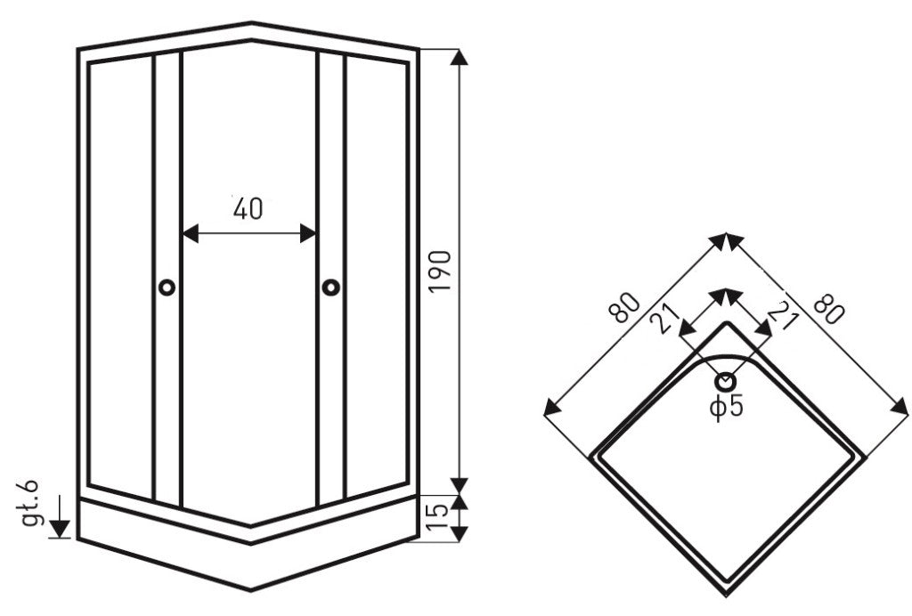 - Méretek: 80 × 80 × 205 cm (kabinház); tálca magassága 15 cm