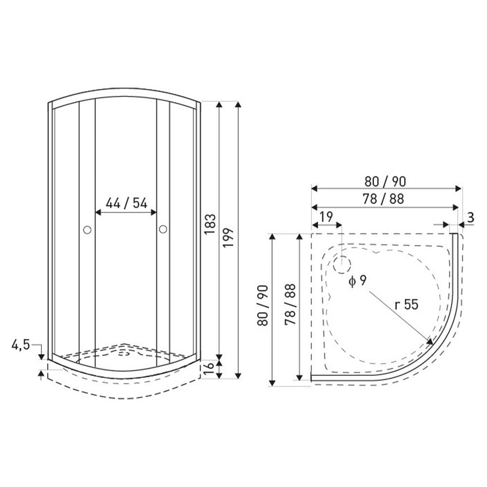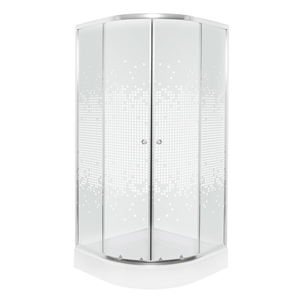 A zuhanykabin 4 mm-es edzett üvegből készült. Fehér dekor négyzetekkel díszített biztonsági üveggel van ellátva. A zuhanykabin íves kivitelben kapható. Dupla görgős ajtókkal van ellátva. A kabin 79x79x183 cm méretű (teljes magassága tálcával: 79x79x199 cm). A fehér akril zuhanytálca 79x79x16 cm!