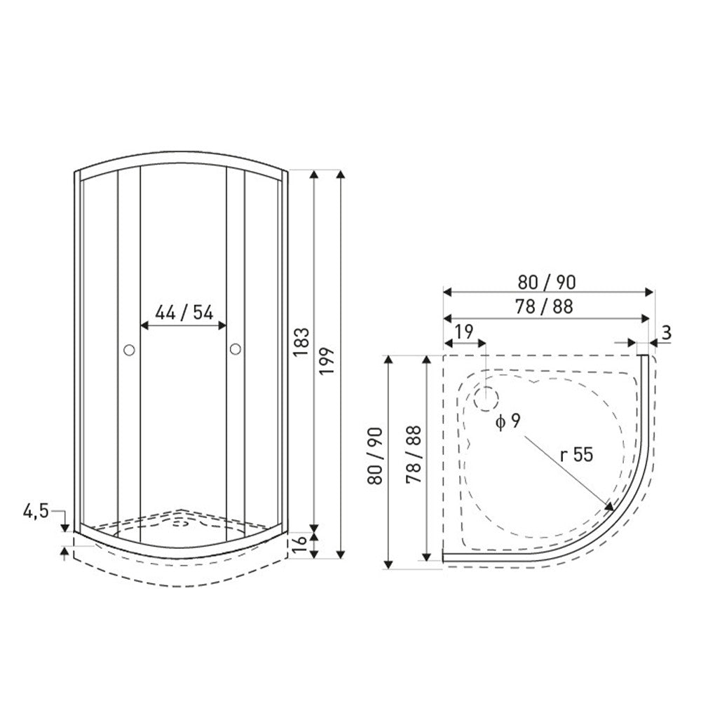 A zuhanykabin 4 mm-es edzett üvegből készült.Fehér dekor négyzetekkel díszített biztonsági üveggel van ellátva.A zuhanykabin íves kivitelben kapható. Dupla görgős ajtókkal van ellátva. A kabin 88x88x183 cm méretű. A zuhanytálca nem tartozék!