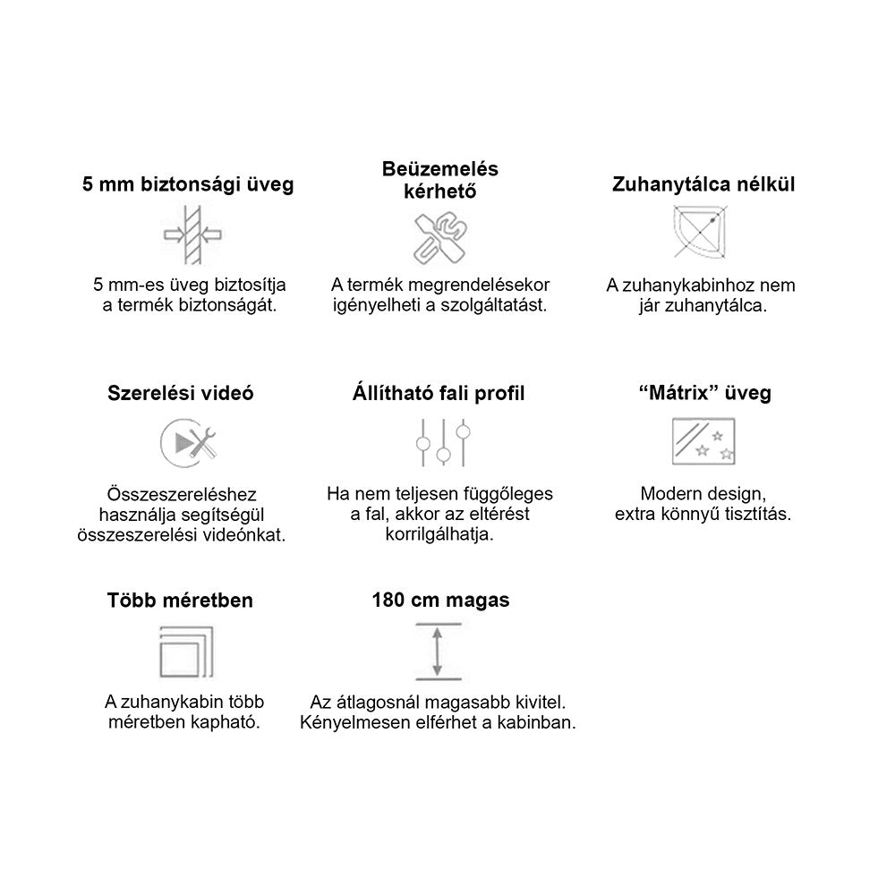 Műanyag vízzáró profilokkal rendelkezik, hogy a víz a kabinon belül maradjon. Az állítható fali profilok segítségével, ha nem teljesen függőleges a fal, akár 15 mm eltérést is korrigálhat. Amennyiben tálca nélkül rendeli, 180 cm-es magassággal, ha pedig szettben erősített akril zuhanytálcával, akkor 194 cm-es magassággal számolhat.