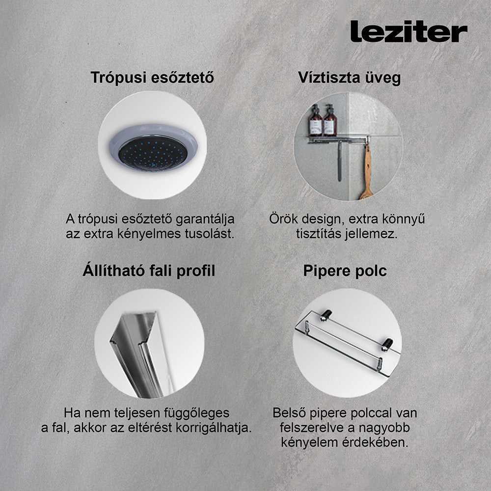 A kabin előnye, hogy hátfalas,melynek köszönhetően nem kell aggódni amiatt, hogy eláztatja fürdőszobája falát. Ezek mellett még számos pozitív tulajdonsággal rendelkezik ez a modern és időtálló zuhanykabin. Méretének köszönhetően kényelmesen elfér zuhanyzás közben.