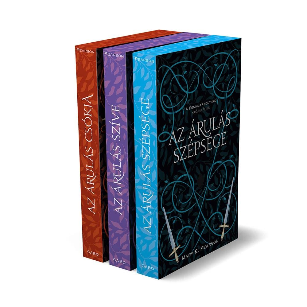 A csomag tartalmazza Az árulás csókja, Az árulás szíve és Az árulás szépsége kötetek élfestett kiadását.