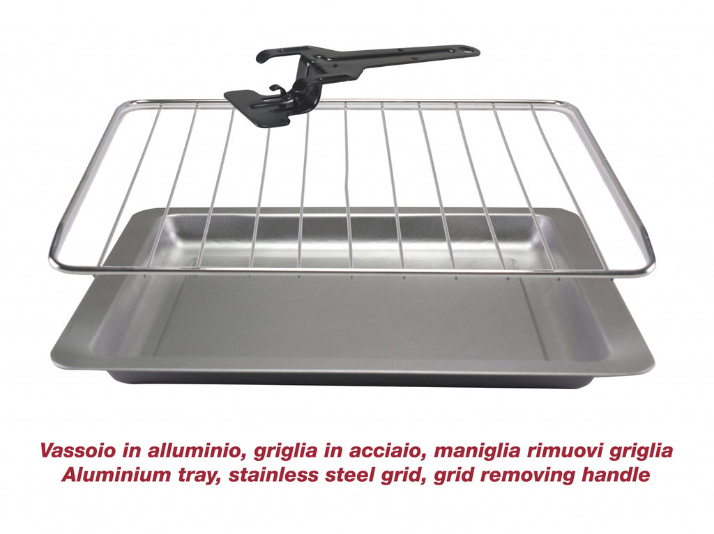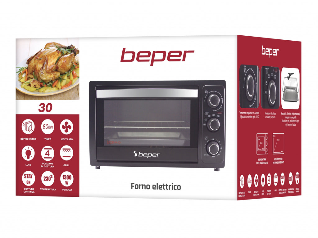 30 liter űrtartalmú légkeveréses sütő dupla üvegfalú ajtóval a hő fenntartás érdekében és rozsdamentes acél fűtőelemmel. 4 választható sütés: alap, grill, kombinált és légkeveréses. Akár 230°C-ig állítható hőmérséklet, belső világítás, 60 perces időzítő hangjelzéssel. Tartozékok: alumínium tálca, rozsdamentes acél grillrács, rács eltávolító fogantyú.