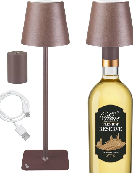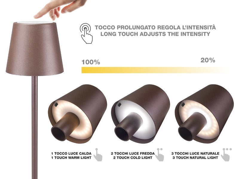 Asztali lámpa érintőkapcsolóval. Egyszerű érintéssel választhat meleg, hideg, vagy természetes fény között. A fény intenzitása a bekapcsoló gomb nyomva tartásával állítható. Vízálló, beltéren és kültéren is használható. Az erős akkumulátor körülbelül 10 órán át folyamatos működést biztosít. Az adapterrel a 33mm-es nyílásu üvegek nyakába helyezhető a lámpa test