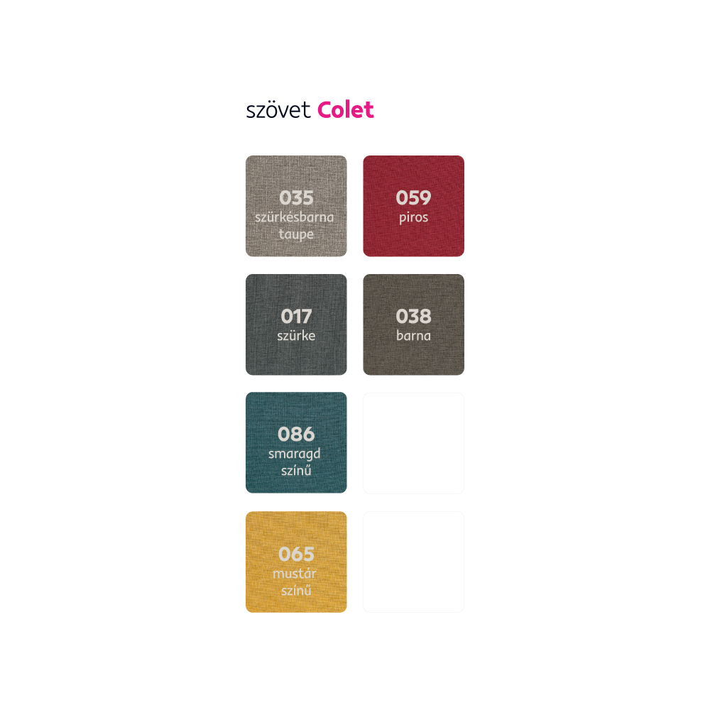 Rendelhető a Colet szövet színváltozataiban. Egyedi megrendelés esetén szükség van az adott összegnek a 20%-át befizetni,mint előleg. Az előleg befizetése után az Ön követelményét benyújtjuk a gyártóna.