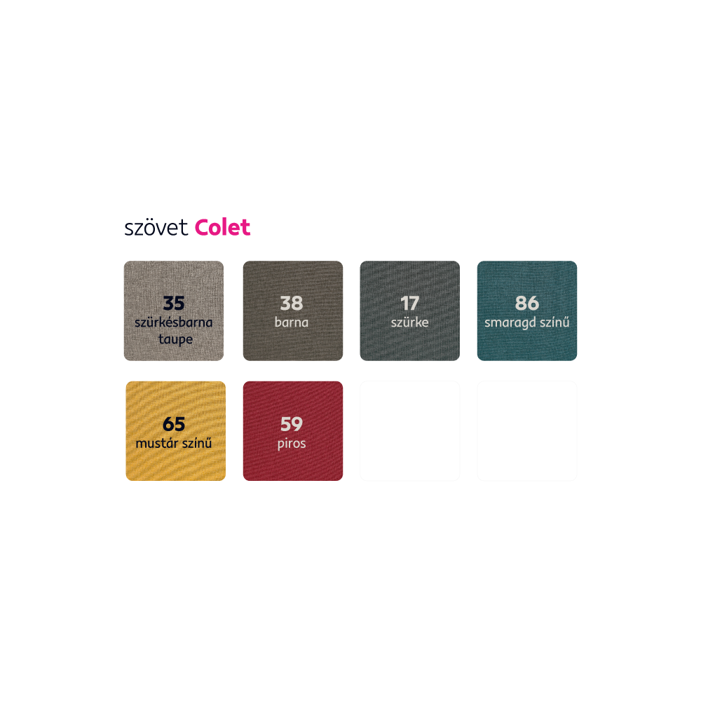 Rendelhető a Colet szövet színválasztékában. Egyedi megrendelés esetén szükség van az adott összegnek a 20%-át befizetni,mint előleg. Az előleg befizetése után az Ön követelményét benyújtjuk a gyártóna. Szállítási idő 8-10 hét.