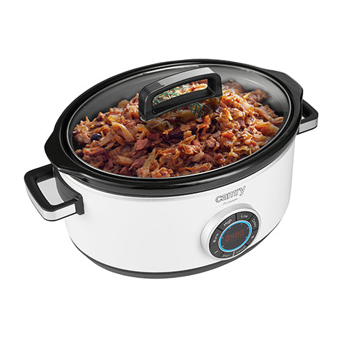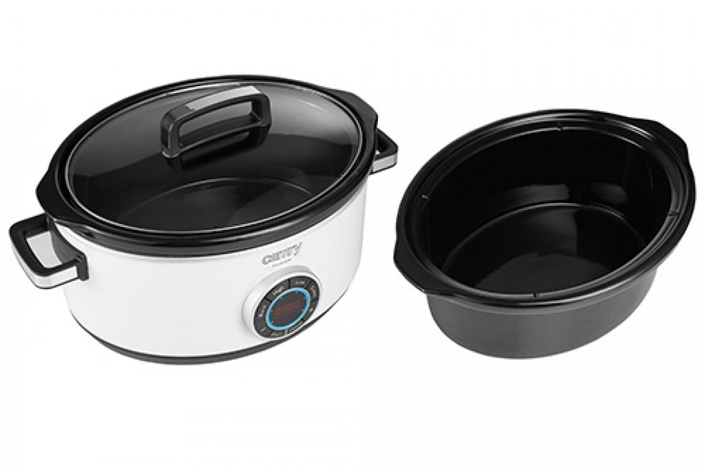 A lassú főzőedény olyan eszköz, amely alacsonyabb hőmérsékleten főzi az ételeket, mint a hagyományos. A CR6410 lassú tűzhely ideális megoldás azok számára, akik szeretnék, hogy az ételek ne veszítsék el az ízét és az egészségügyi értékeiket főzés közben. A lassú tűzhelyben készített ételek gazdagok mikroelemekben és vitaminokban, amelyek a forrásponthoz közeli hőmérsékleten a hagyományos főzés során elpusztulnak. A kivehető kerámia edény könnyen tisztítható. Természetes alapanyaga nem változtatja meg az ételek ízét, és garantálja a hő egyenletes eloszlását és az étel hosszú távú fenntartását. Bár a készülék működés közben forró, a ház és a fedő hőszigetelt fogantyúi lehetővé teszik a kényelmes használatot. Az üvegfedél biztonságos edzett üvegből készül, így a tál kinyitása nélkül megkönnyíti a főzési folyamat felügyeletét. A tál térfogata 6,5 liter lehetővé teszi egyedényes étkezés elkészítését egy nagy család számára vagy 2 napig.