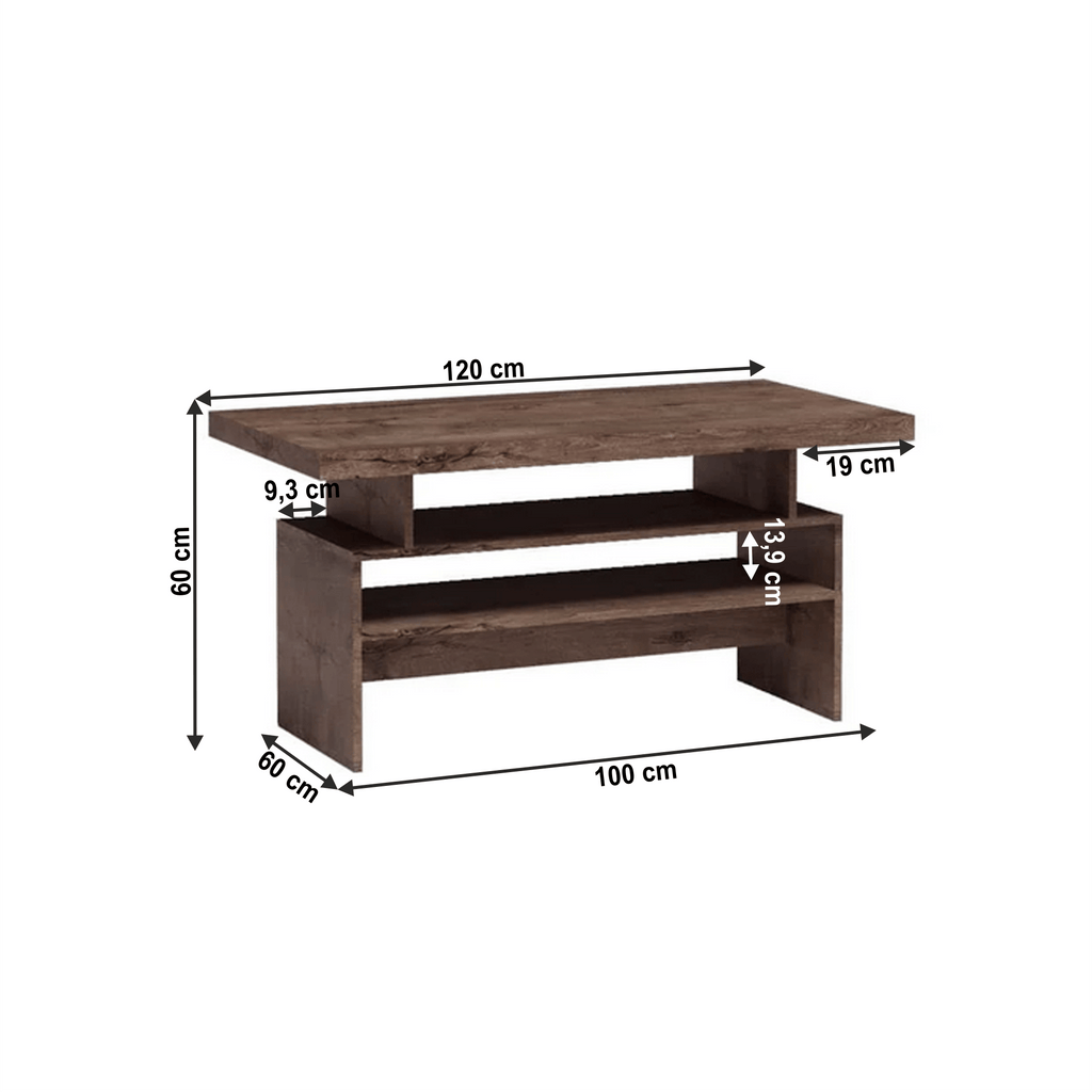 Dohányzóasztal INFINITY 13 Váz: 48 mm vastag Fém fogantyúk Anyag: laminált DTD, ABS élek Színváltozat: sötét kőris Méretek (SzéxMéxMa): 120x60x60 cm Szállítás szétszerelve.