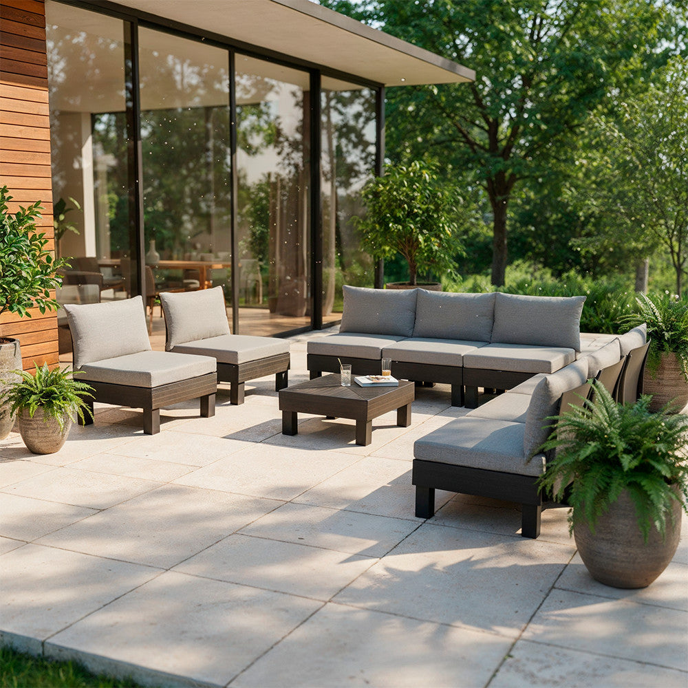 Az Elements II 8 személyes kerti bútor garnitúra tökéletes választás azoknak, akik nagyobb társaságok számára keresnek elegáns és kényelmes ülőhelyet. A szett moduláris kialakításának köszönhetően szabadon kombinálható: kialakíthatsz belőle kör alakú beszélgetősarkot, két hosszabb kanapét vagy U-alakú lounge elrendezést.