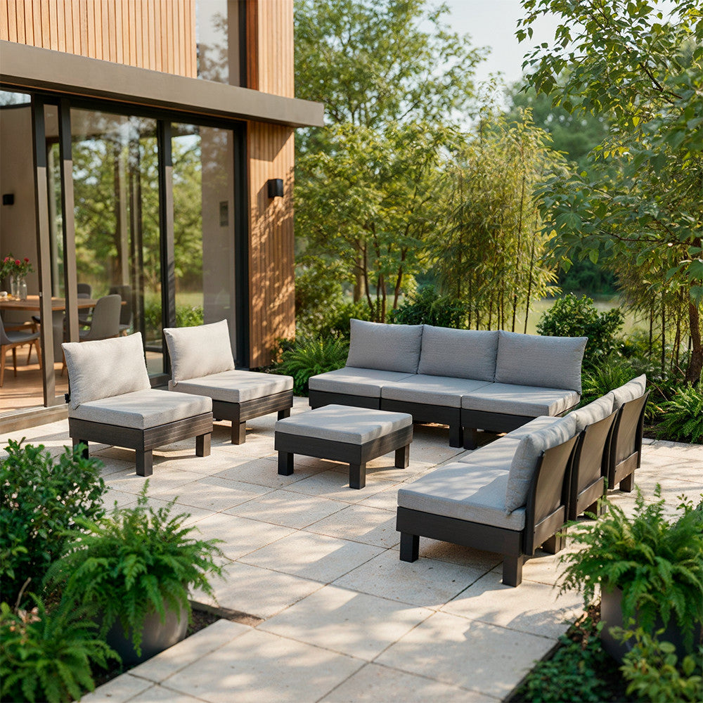 A szett akár nyolc fő számára is kényelmes ülőhelyet kínál, így tökéletes választás családi összejövetelekhez, baráti estékhez vagy szabadtéri pihenéshez.