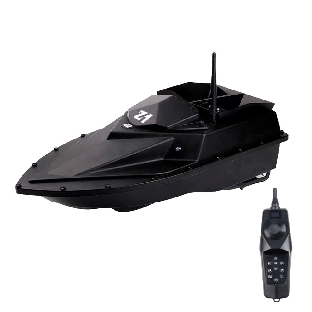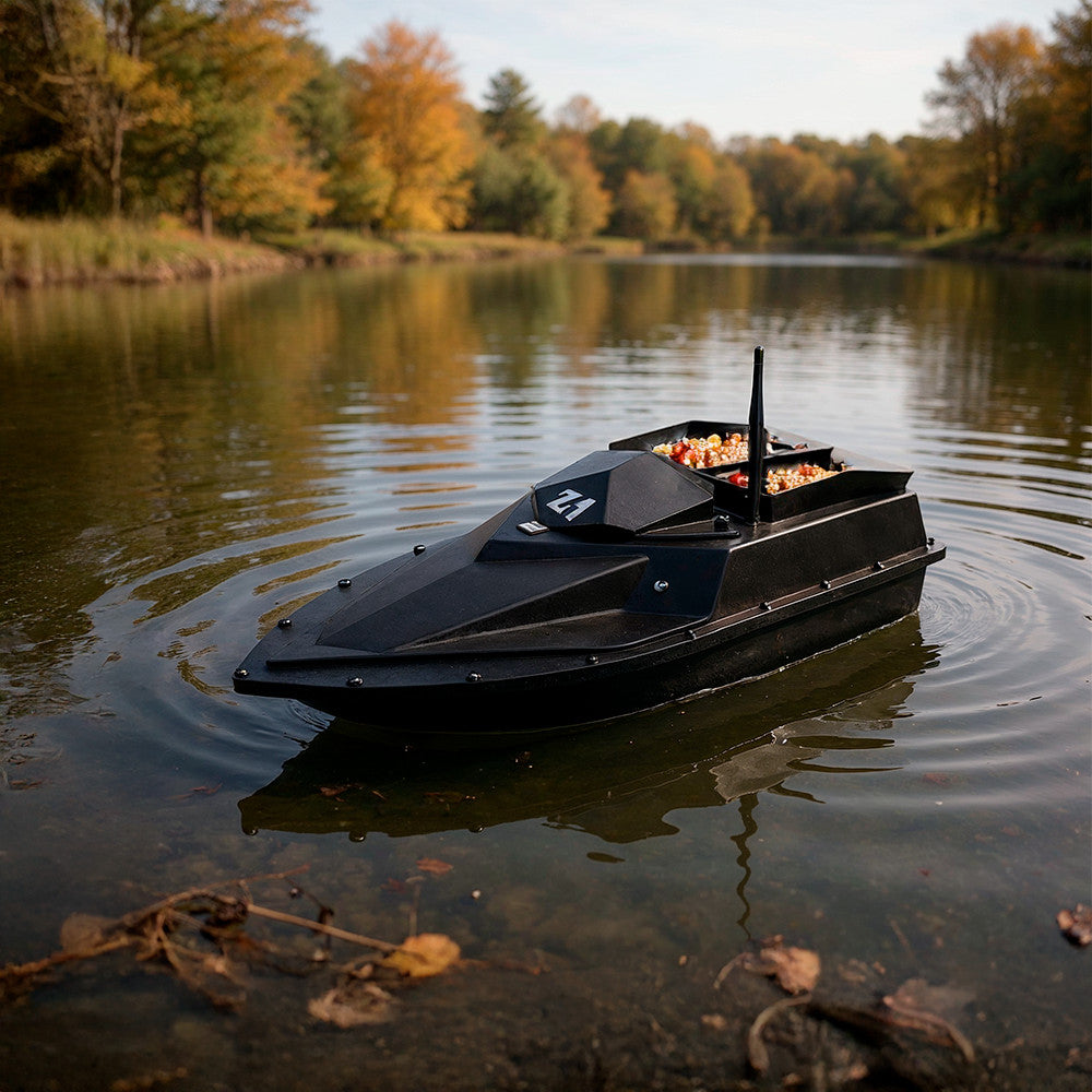 A fekete testű etetőhajó formatervezett kialakítása nemcsak modern megjelenést nyújt, hanem kiválóan ellenáll a fröccsenő víznek és a kisebb hullámzásnak is. A hátsó ürítési mechanizmus egyszerűen kezelhető, így gyorsan és pontosan lehet etetni bármilyen horgászhelyen.