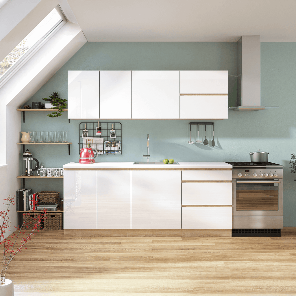 Alapkonyha: a váz DTD laminált sonoma tölgyfa, ajtók - , vagy a váz fehér magasfényű HG DTD laminált fehér/ajtók sonoma tölgyfa. Felső méret a füstelszívó szekrénykével: 2,6 m, alsó méret: 2,6 m,
