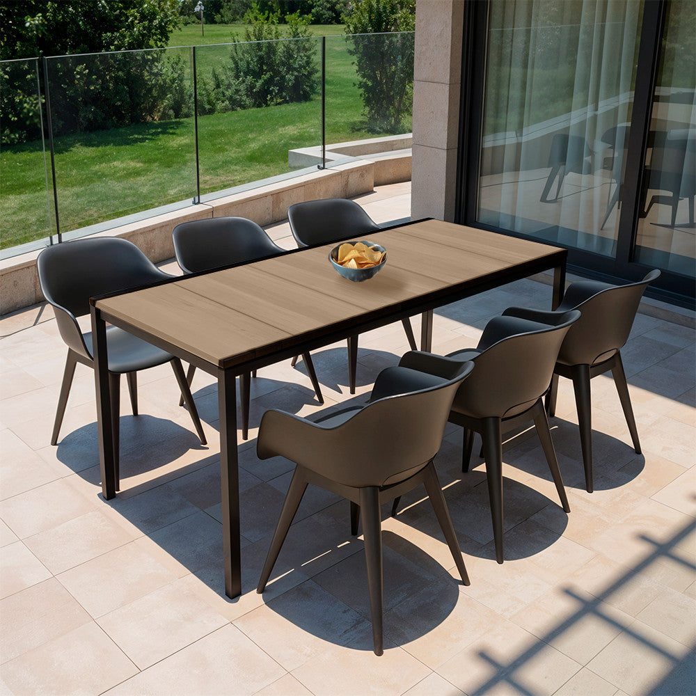 A meleg, természetes kőris tónusú asztallap és a hűvös grafit székek kontrasztja minden stílusú kültéri térben magára vonzza a tekintetet: skandináv, mediterrán vagy ipari környezetben is kifinomult megjelenést ad.